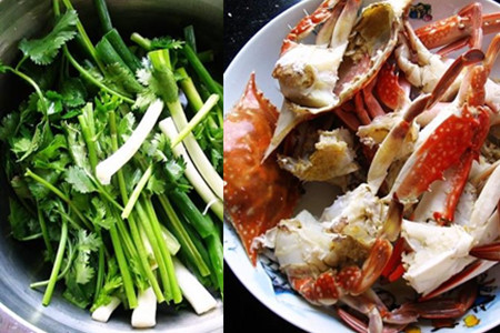 葱洗净切寸段,香菜洗净切段,生姜洗净切成片。海蟹刷洗干净,斩成小块。