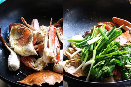 炒锅至于灶上,加适量油烧热,油热之后,加入适量豆瓣酱煸炒。豆瓣酱炒出酱香味之后,将处理好的海蟹下锅,用铲子炒匀。翻炒几下之后,撒入适量食盐,继续翻炒。接着烹入适量生抽和白酒,注入少许清水,炒匀,加盖焖煮片刻。锅里的汤汁快要收干时,将葱段和香菜下锅,炒匀即可熄火捞出食用。