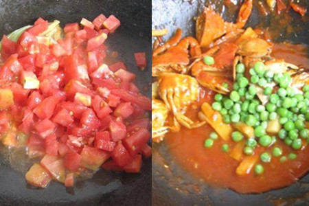 食材:小海蟹4只、年糕100克、大番茄1个、葱姜、韩式辣酱、番茄酱、熟豌豆、盐、油。