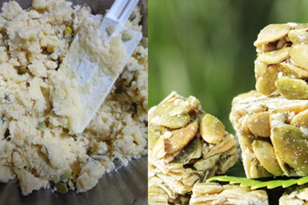 第二,将南瓜子仁下热锅中炒熟,放入烤箱中保温。