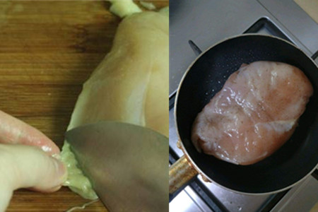 第二,将鸡胸肉用清水揉搓冲洗一下,切成薄一点的片状,下到油锅里慢煎一会儿,可以调点盐加味,待到肉的表皮微微变色即可,然后将肉下到热水锅中彻底煮熟后捞出沥水,用手将它们撕成细丝状备用。