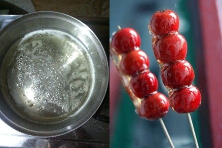 山楂洗干净不用去籽,用竹签一个个串号。然后就是用平底锅倒入一把冰糖,就开始小火的熬糖,用筷子慢慢的搅拌。让水分满满的蒸发,看着气泡由大变小,然后糖的颜色开始转成黄色就关火。把串好的山楂慢慢的在糖浆里旋转,直至挂满糖浆。这样,一串看起来就让人口水分泌加快的冰糖葫芦就做好了。就是那么的简单,还在找回忆的你还不试一下么?