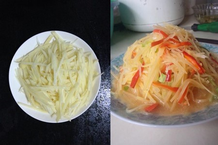 爱吃马铃薯的吃货们,一定会吃的家常菜肴就是酸辣土豆丝。这道菜口感酸辣开胃、百吃不厌,但是一盘好的酸辣土豆丝考验的不仅仅是味道,更多的是刀功,刀功决定了土豆丝的品质。把马铃薯尽量切成细小的丝状,胡萝卜切成丝状。然后干辣椒切段,剁椒切碎,蒜切碎。开大火放油、干辣椒、剁椒等爆炒,放入土豆丝加点醋炒两分钟。一盘土豆丝就完成了。