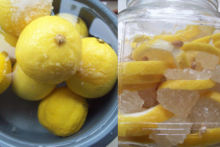 泡好的柠檬冲洗干净,擦干,切片,放进消毒好的玻璃瓶中,瓶子要无水无油,否则做出来的糖渍柠檬会容易坏。放的时候要放一层柠檬,放一层冰糖,放好以后可以用勺子戳一下,加快柠檬汁和冰糖的析出。然后密封放进冰箱中,一周以后,糖渍柠檬就可以吃了,放的时间越久,味道越好。