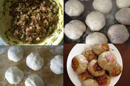3、面醒好后,取出来再揉搓一下,分成大小均等的小面团,一个个擀成面皮。放上适量的牛肉馅,再像包包子一样包起来,注意把收口的地方捏紧,稍压扁。