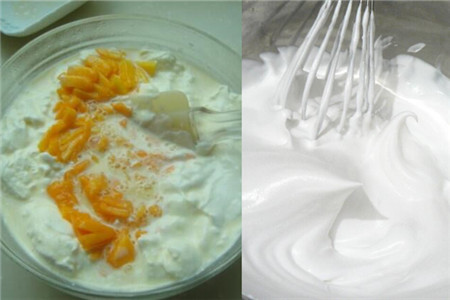 把奶油做好之后放在一个干净的盆子里面,然后倒入刚刚的芒果泥,把它们搅拌均匀,搅拌均匀之后倒入适量的牛奶。倒入的牛奶必须要选用纯牛奶,因为其他的牛奶基本上都是属于饮料牛奶,这样做出来的冰淇淋也不会非常的好吃。将这三样食材搅拌均匀之后,倒入模具里面。