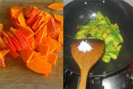 将南瓜削皮之后切成南瓜片,但是南瓜片不要切得太厚,不然不容易将它炒熟。在油温适中的时候放一点干辣椒进去,将辣椒翻炒一下之后再倒入南瓜。因为南瓜不容易炒熟,所以我们等南瓜翻炒一会儿之后适当的放一点清水进去,炒南瓜的时候火不要开的太大。