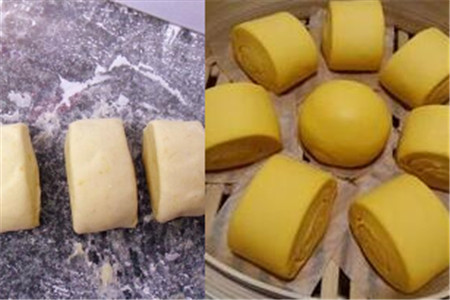 差不多半个小时之后面团就已经发酵完成了,接下来我们就可以做南瓜的模型,我们可以直接将面团搓成长条再用刀来切成小块,这样蒸出来的馒头就是我们在外面所买到的馒头的形状。如果家里面有模具,我们可以见面团放在模具里面,做出我们喜欢的样子。