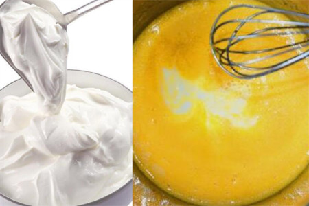 用刚才所剩下的蛋清加入适量的白糖,使劲的用筷子的将它打发,当然如果家里面有电动的打蛋器要方便许多,直到将蛋清打成奶油的形状。将刚才所做的蛋黄液和奶油倒在一起,然后把它们搅拌均匀放入烤箱就可以了。