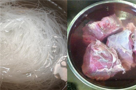 先把牛肉和粉丝分开浸泡,等粉丝泡发变软,牛肉浸泡出血水后就可以进行下一步骤了。