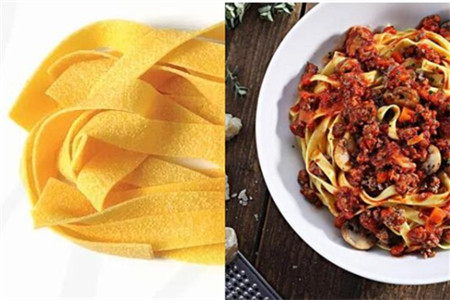 第四种为大家介绍意大利面中的宽面,宽面的外形很像国内的刀削面,但是比刀削面要长,但是煮的时间是差不多长的。同样,在煮这种意大利面的时候我们也可以在锅内加上一小勺盐,加快面熟的速度。这种意大利面因为较厚,所以一般会搭配上比较浓郁粘稠的酱汁。
