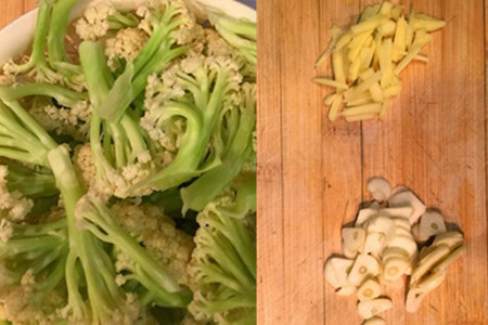 浸泡好以后,再用清水清洗一遍就可以了。将洗好的花菜放入沥水篮中,沥干花菜的水分备用。将生姜和大蒜去皮,切成碎末备用。