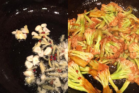 往锅中倒入适量的清油,将切好的生姜大蒜放入锅中。大火将锅中的佐料炒出香味。倒入适量的蚝油,翻炒出油香,将煎好的花菜倒入锅中,大火翻炒。
