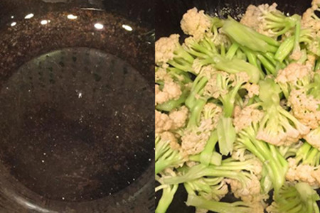 煎花菜。干煸花菜吃起来比较绵软清甜是因为花菜里面的水分去除了一些,糖分得到了浓缩。所以要将花菜煎一下,去除花菜中部分水分。将锅擦干,烧热后倒入花菜,稍微煎一下。煎的时候要注意翻炒一下,以免花菜糊锅。当然,如果家中有不粘锅,那么效果会更好一点。