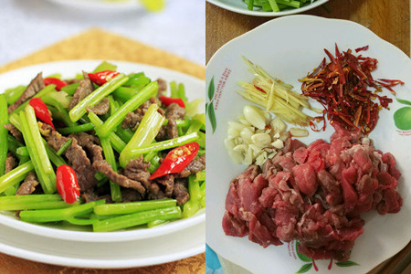 第三种是芹菜炒牛肉。需要准备的食材有两百克牛里脊、两百克芹菜、三克食盐、两克味精、三个红辣椒、一枚鸡蛋、少量高汤。