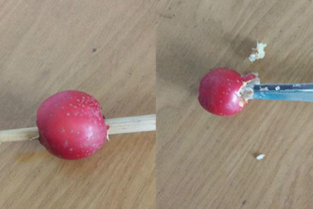 将购买的山楂用筷子将山楂中间戳一个洞,再用挖勺将山楂里面的籽都捞出来。这一点会比较麻烦,但是为了好吃的山楂罐头,这一步要仔细做,不能马虎。籽没挖干净,吃的时候口感就大打折扣,所以尽量放慢动作慢慢挖。