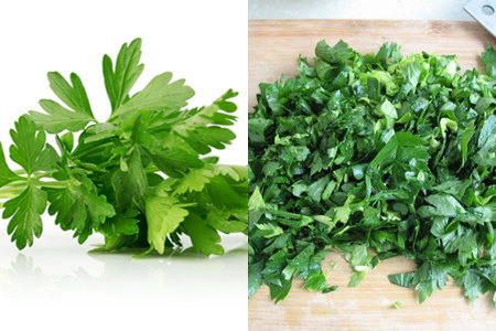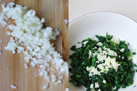 6、将大蒜碎末和芹菜叶子一起放在碗里搅拌。