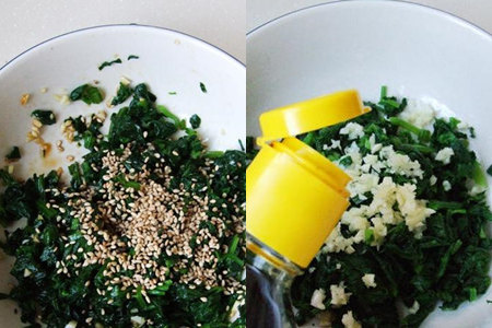 7、根据自己的爱好,将盐生抽、糖、香醋和香油放适量到芹菜叶子的碗里一起搅拌。