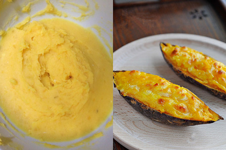 把经过处理的地瓜泥倒入地瓜壳中,再在上面撒上一些芝士碎。