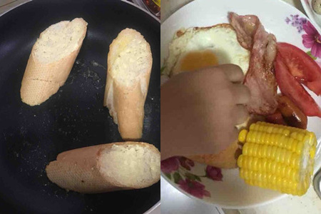 第一种需要准备的食材有一小块法棍、一枚鸡蛋、一根玉米、六颗脆皮肠、两片培根、半个番茄。