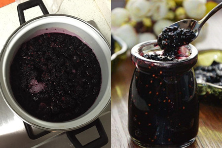 首先将桑葚洗干净,再把它和白砂糖一起倒入碗中,一边用勺子搅拌一边将其碾碎。随后,将柠檬榨汁,并将其与已经经过处理桑葚一起倒入锅中,并倒入适量清水。用中火将其煮熟,再把火调小,并倒入麦芽糖。待其搅拌均匀之后,再煮一会儿就可以把火关了。将桑葚酱装入瓶中,待其凉了之后,将盖子盖上,并放入冰箱中冷藏。要吃的时候再拿出来。
