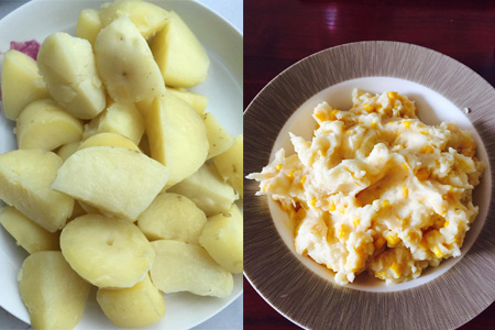 首先,把马铃薯去皮切成小块蒸熟,玉米去芯切成玉米粒。马林苏蒸熟后取出用工具捣碎,加入牛奶,搅拌均匀成土豆泥。把黄油放入锅中加热,融化以后倒入玉米粒,翻炒至玉米粒金黄,火不要太大否则玉米容易焦。玉米粒炒熟把刚才捣成你的土豆加进去以后再炒至它们混合均匀就完成了。