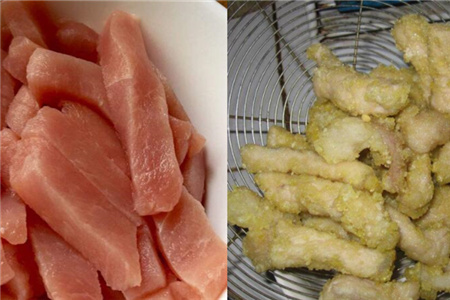 首先是食材的挑选,好的里脊肉应该是颜色为淡红色,如果颜色发暗说明肉质已经不新鲜了。里脊肉除了挑选以外,切肉条也有讲究,切的时候要沿着猪肉的纹理横向切,不要逆向切。因为逆向切的肉条等下在烹饪过程中容易松散,而且口感也不好。