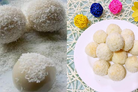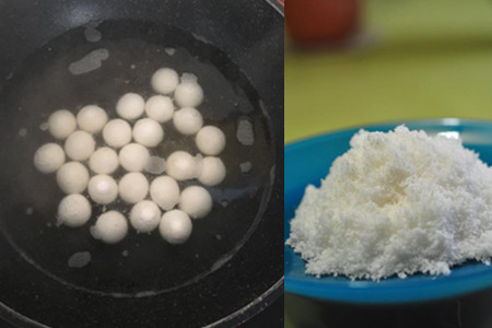 3、将椰丝铺在一个盘子中,放在一边待用。待汤圆浮在水面上时,用漏勺将汤圆全部捞出,控干上面多余的水分。把汤圆放在铺着椰丝的盘子中,在上面均匀翻滚一圈,使其表面充分地裹上椰丝。