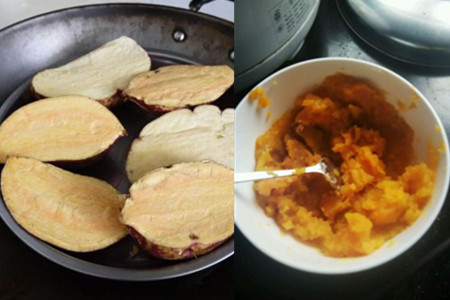4、把蒸好的地瓜从蒸锅中取出,剥去它的外皮。趁热用勺子将地瓜捣烂成泥状,往里加入些许的糯米粉进行充分地搅拌。再用手揉搓成面团状,如果面团太湿,可以往里多加些糯米粉。一定要揉搓至面团表面光滑且不粘手为止。