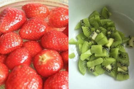 2、将新鲜的草莓择去根蒂,浸泡在淡盐水之中,以此洗净草莓的杂质。但是草莓浸泡的时间不宜过久,以免草莓泡烂。将猕猴桃用刀削去外皮,切成小块状。火龙果剥去外皮,再用刀切成块状。