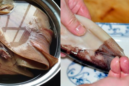 2、先将买回来的新鲜的鱿鱼放在清水中,清洗干净,去除表面的黑膜和内脏等不能食用的部分。在清洗鱿鱼的时候,可以往水中加些白醋,这样既能去除鱿鱼的腥味,又可使鱿鱼黑皮轻松去除。