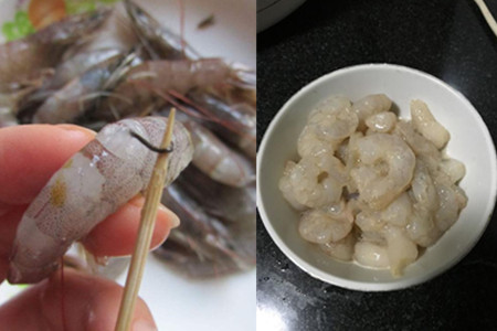 3、把买回来的鲜虾剥去外壳,剔除里面的虾线,放在清水中清洗干净。再控干多余的水分,往里加入些许的料酒进行腌制片刻。