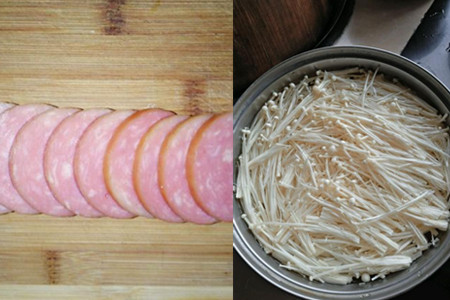 2、先将生姜、火腿用刀切成片状,但是不能太厚,这样不容易入味。把蘑菇、金针菇用剪刀剪去根蒂部,将其一齐放入淡盐水之中,浸泡半个钟头左右。蘑菇的浸泡时间不宜过久,以免蘑菇泡烂。把洗净的蘑菇和金针菇放在砧板上,金针菇切成段状,蘑菇切成片。