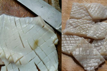 3、把处理好的鱿鱼控干水分,放在砧板上。在鱿鱼表面用刀划上几个花刀,再在垂直方向继续划花刀。划花刀的时候,不能将鱿鱼切断。这样切出来的鱿鱼既好看美观,由比较容易入味。接着再把鱿鱼切成块状,置于一边待用。