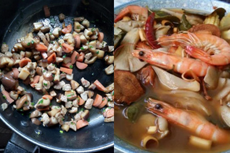 5、这时候再往锅中倒入腌制好的虾仁,翻炒至其变色后。淋上些料酒,倒入适当的椰浆,加入酸辣汤料、适量的水。大火烧开开始冒泡后,改为小火继续煮上五六分钟。临出锅前,挤上些柠檬汁,撒上些香草、黑胡椒,便可出锅食用了。