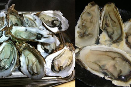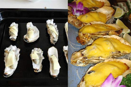 4、将芝士从冰箱之中取出,用刀切成薄片状。把切好的芝士片摆在牡蛎肉上,撒上些披萨草。将烤箱事先预热,把牡蛎放在烤盘之中,烤上五六分钟便可食用。