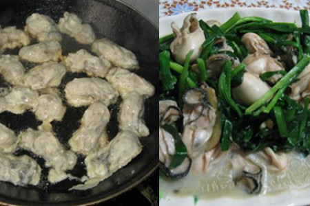 6、将适量的食用油倒入炒锅之中,油温加热到七八成时。把牡蛎肉一齐下入油锅之中,炸制片刻,便可漏勺捞出控干多余的油分。