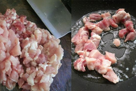 3、把瘦肉清洗干净表面的血水,把它放在砧板之上,用刀切成小丁状。将芹菜洗净干净表面的泥沙,用刀切成碎末状。如果不喜欢吃芹菜,也可以不使用芹菜。
