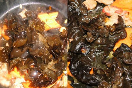 胡萝卜和肉片炒好以后将处理好的黑木耳倒入锅中,大火翻炒。加入适量的食盐,喷洒一点水,继续大火炒。食盐遇到高温是会产生有害物质的,所以尽量晚一点加入食盐,对健康会好一点。黑木耳炒熟以后这道菜就可以出锅了。