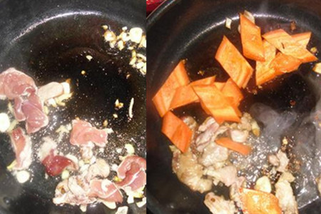 往锅中倒入适量的食用油,然后倒入切碎的生姜大蒜,大火烧。待锅中的佐料炒出香味以后将肉片倒入锅中翻炒,肉片炒熟变成质地硬一点的片状的时候将胡萝卜片倒入锅中翻炒。胡萝卜不是很好炒熟,所以要让它在锅中稍微煎一下。