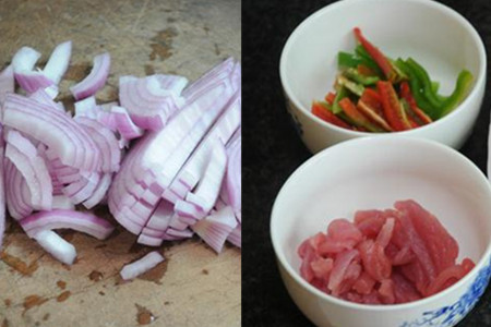 处理食材。将洋葱去掉外皮,再把头尾都切掉。放在水中稍微冲洗一下就可以了。将洗干净的洋葱剖成两半后再顺着纹路切成洋葱丝。将洋葱丝放在碗中备用。将猪肉稍微清洗一下,然后擦干猪肉表面的水分。再将猪肉切成均匀的肉丝。
