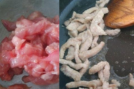 将锅擦洗干净后倒入适量的食用油。大火将锅中的油烧热,将腌制好的肉丝倒入锅中大火翻炒,炒制肉丝变色成为灰白的就可以停火了,将肉丝盛起来,油留在锅中。肉丝裹了淀粉,是不容易炒老的,没有炒熟的肉会有腥臊肉味,所以尽量让肉在锅中多炒一会儿。一来去一下肉丝的腥味,二来还能让肉的味道变得更加鲜美。