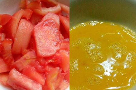 准备好食材以后就要处理食材。将西红柿外皮清洗干净以后稍微沥一下水分,沥干水分以后切成均匀的块状备用。切块的时候不要切太大,太大了不容易炒熟,而且不容易出汁。也不要将西红柿切得太小快,太小块的西红柿炒制的时候就会化成水,那就成了西红柿酱了。
