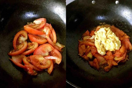 将西红柿倒入油锅中,大火开始翻炒,西红柿炒熟以后再炒一会儿,就会出很多的西红柿汁,这个时候不要加水,会将西红柿的味道冲淡。炒出西红柿汁以后将鸡蛋倒入锅中,撒入适量的食盐,倒入一点酱油后,大火翻炒均匀,这道菜差不多就可以出锅了。