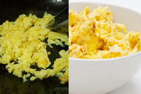 切记不要急着用锅铲搅动鸡蛋液,让鸡蛋液在锅中慢慢煎成鸡蛋饼。如果火太大不好掌控,可以将火打小一点。鸡蛋一面煎好以后要翻面将另一面也煎一下。两面都煎成金黄色以后就用锅铲将鸡蛋斩碎,稍微翻炒一下,就可以出锅了。