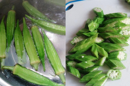 将秋葵清洗干净后整个放入锅中,加入适量的水淹没秋葵。大火将锅中水煮沸,煮沸以后翻动一下锅中的秋葵,让秋葵能够均匀受热。秋葵煮熟以后颜色会变得更加翠绿。这个时候关火,将秋葵摊凉后切成片状放在碗中备用。