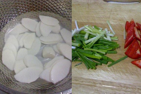 给山药去皮的时候一定要注意先将外皮洗干净,因为山药去皮以后容易流出一种比较黏腻的液体,这种液体很容易沾上污渍,沾上以后还很难洗干净。红椒清洗干净后切成块,葱洗干净后切成条备用。