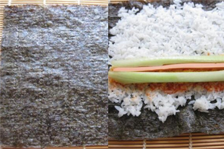 接下来就是制作寿司的重要步骤,那就是卷寿司。为了让寿司能够被卷得更加好看,我们需要准备好一个卷寿司用的卷帘,这种寿司帘在各大超市均有售卖,很好购买。然后将一张大的紫菜放在寿司卷上,用准备好的米饭平铺在紫菜上,铺好之后可以适当的用饭勺压一下,这样可以让米饭更加的紧实。然后我们可以在米饭上挤上一点番茄酱或者是沙拉酱。