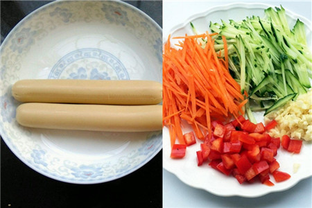 将米饭准备好之后,我们就可以接着准备关于寿司的配料。比较常见的紫菜包饭寿司只需要我们准备好火腿肠、黄瓜和胡萝卜即可。将所有的食材都切成长条,然后将其尽可能的切细一些。因为这些材料要更加的细碎才可以让寿司的口感上升。并且细条的胡萝卜丝和黄瓜丝还可以更容易被我们所接受,对于部分的小孩子来说,也更加容易下咽。