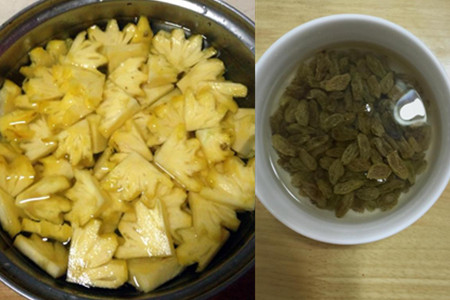 2、先将买回来的菠萝用刀削去外皮,切成大小适当的块状。把切好的菠萝块放在淡盐水之中,以去除菠萝中的酶,以免身体出现过敏的状态。